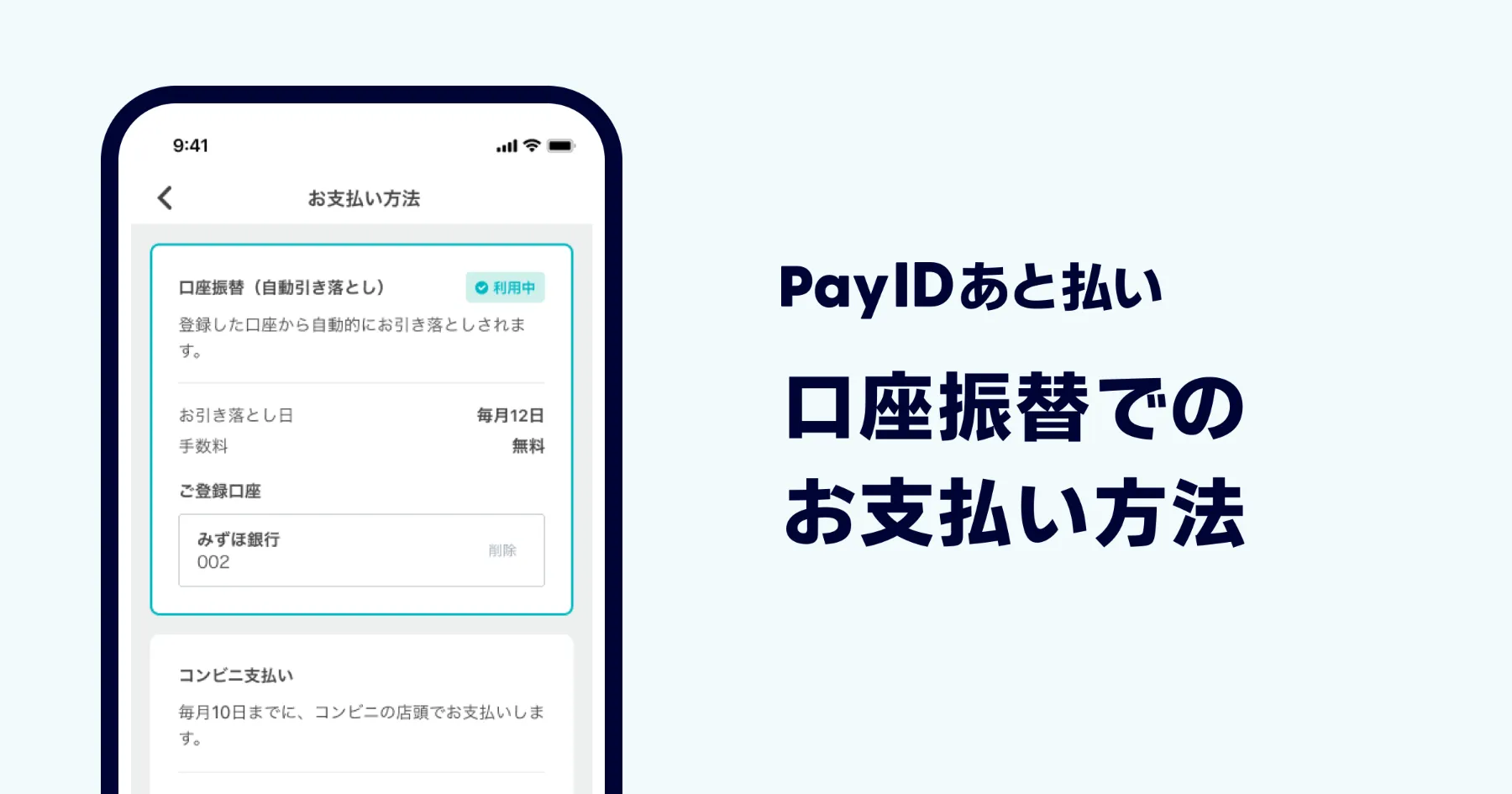お支払いは紙の請求書が必要ないので、Pay IDアプリだけで完結できます。コンビニの店頭でアプリのバーコードを見せるだけ。口座振替なら、自動で引き落としもできます。