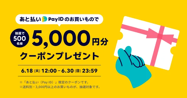 期間中に、「あと払い(Pay ID)」をご利用いただいた方のなかから、抽選で500名様に、「あと払い(Pay ID)限定」の5,000円分のクーポンをプレゼントするキャンペーンを実施します。