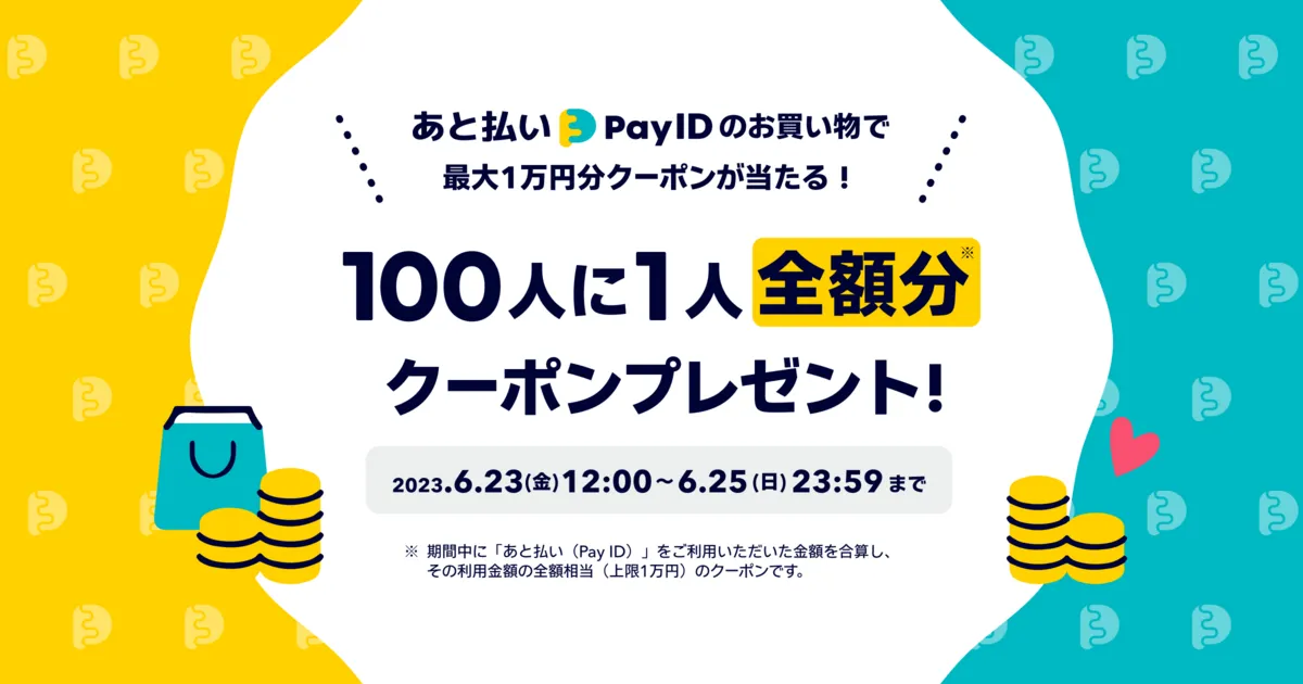 期間中に、「あと払い(Pay ID)」をご利用いただいた方のなかから、抽選で100人に1人の確率で、ご利用金額の全額分(最大1万円分)のクーポンをプレゼント