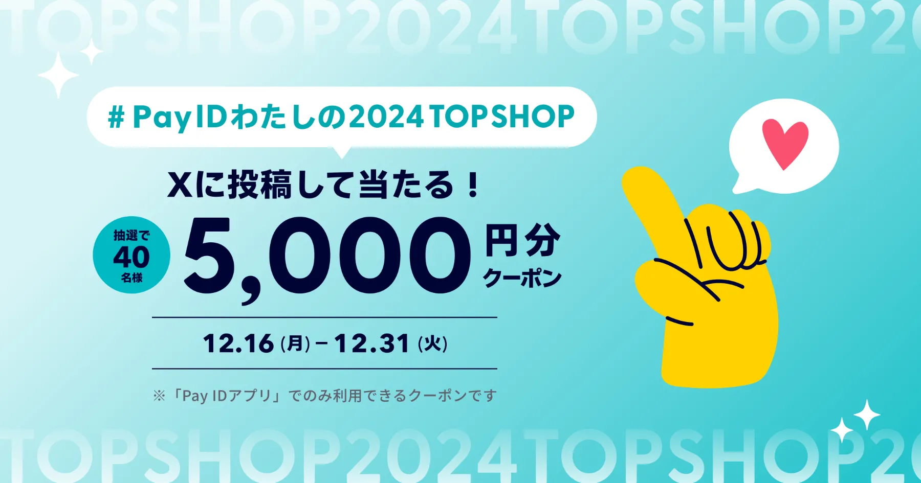 それにともない、2024年12月16日(月)〜31日(火)まで「#PayIDわたしの2024TOPSHOP」投稿キャンペーンを「Pay ID」公式Xにて開催いたします。
