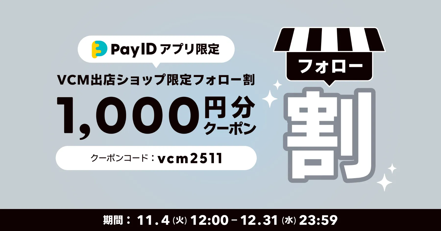 「VCM VINTAGE MARKET Vol.7」参加ショップをフォローすると使用できる、「Pay IDアプリ」限定1,000円 OFF クーポン