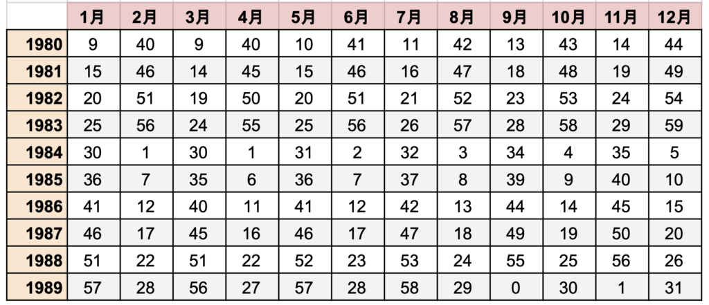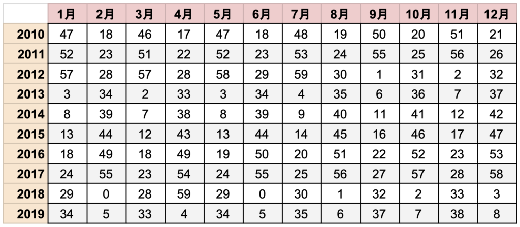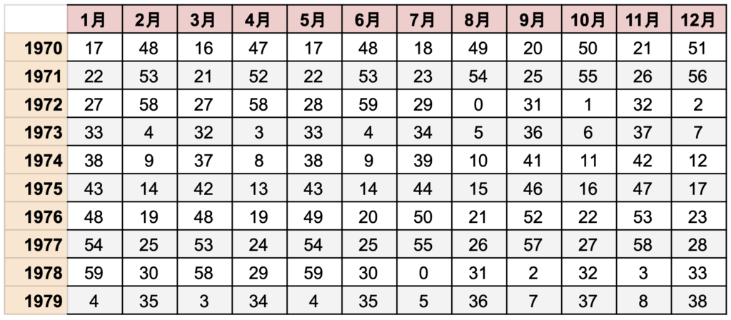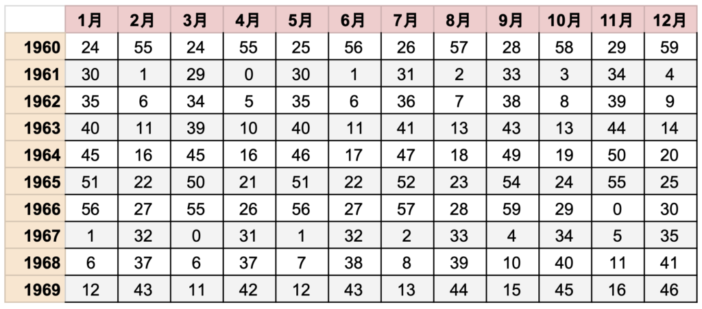 ①下記の表から生まれた年と生まれた月が交わる数字を見つけてください