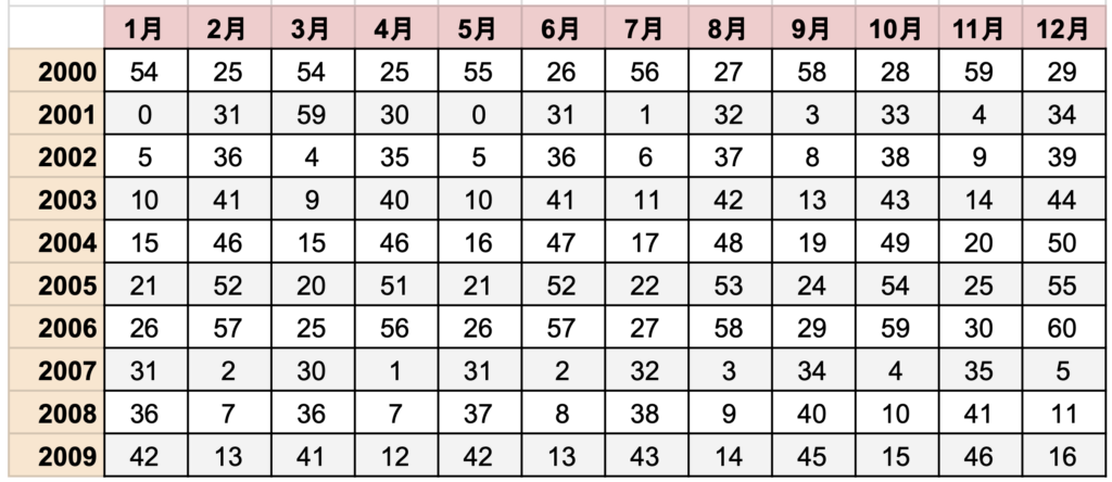 例:2000年1月1日生まれの場合、表の数字54+1=【55】…「5」